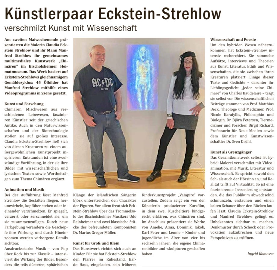 Nach unserem Projekt „Ferne Welten“, geht es von der Abstraktion zu den figurativen Darstellungen der „CHIMÄREN“. Ausgangspunkt ist der Gemäldezyklus CHIMÄREN von Claudia Eckstein-Strehlow (gearbeitet in Öl auf Leinwand), der von Manfred Strehlow in Filmen visualisiert und von ihm ausgesuchter Musik unterlegt wurde. Darunter sind Werke des Komponisten und Musikers Dr. Marius Gregor Müller und ein Trommel-Solo des Musikers Udo Reinheimer. An einem der 3 Tage stellt Bardo Haus ein ca. 50 Jahre altes Exponat vor. Weiterhin wird in Texten, Gedichten und Interviews das Thema „CHIMÄREN“ vertieft.